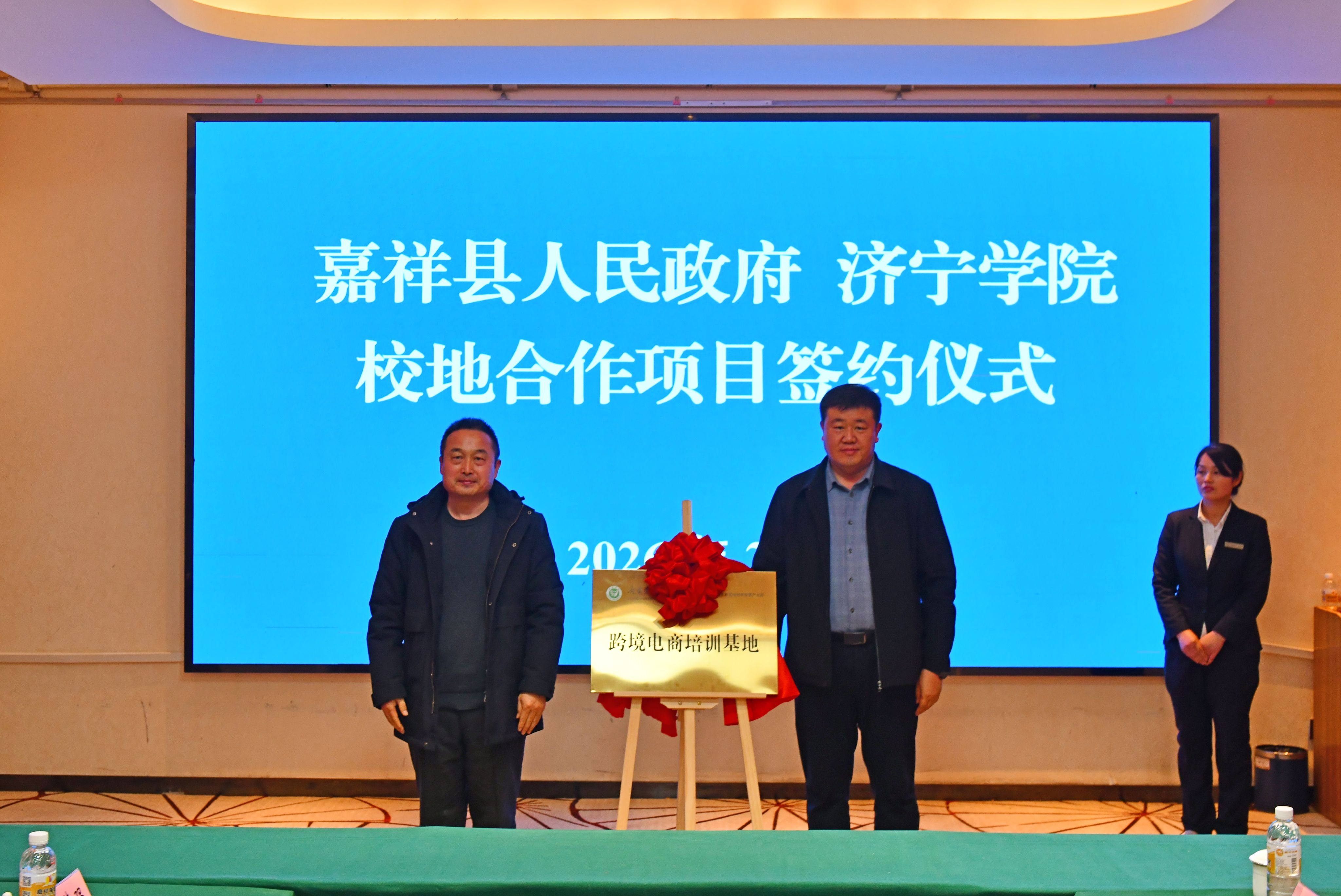 济宁学院外国语学院党委书记陆波与嘉祥县嘉祥街道党工委书记吴震共同为“跨境电商培训基地”揭牌。