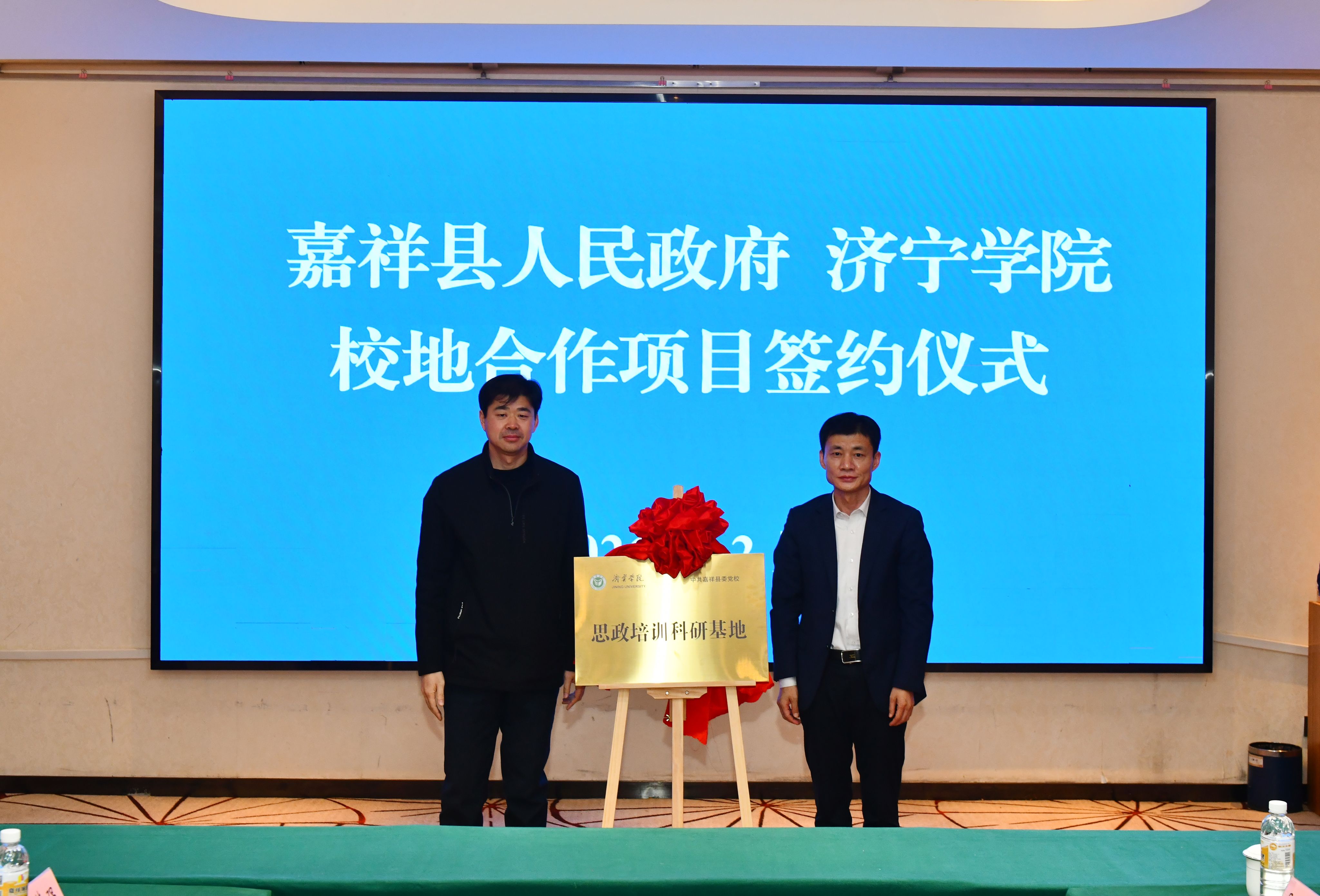 济宁学院马克思主义学院院长王振平与嘉祥县委党校党委书记、常务副校长高夫龙共同为“思政培训科研基地”揭牌。